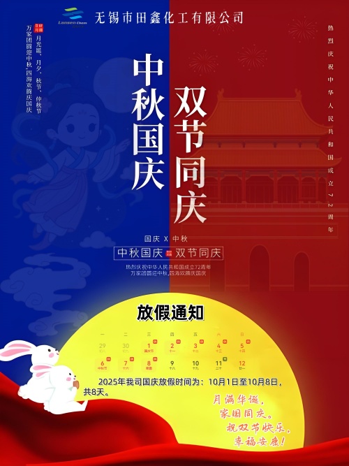 您好!國慶中秋雙節(jié)將至,田鑫化工放假時間安排如下: